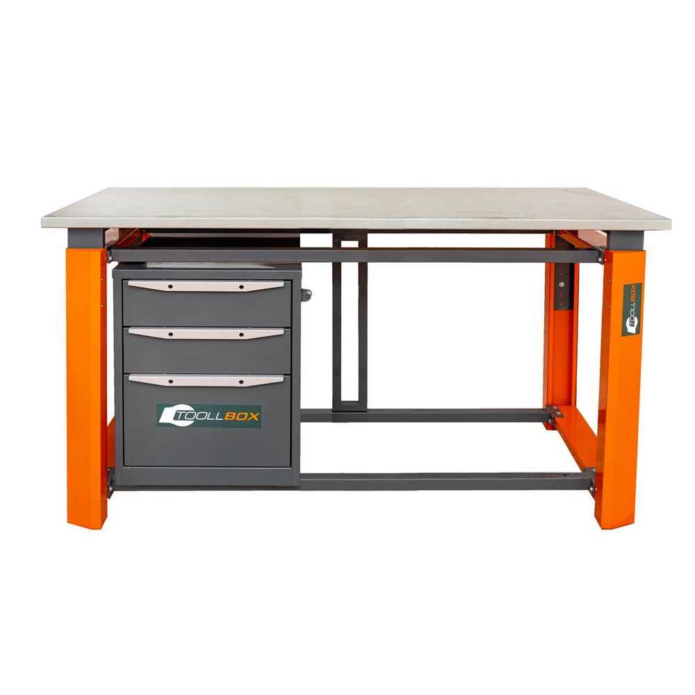 Верстак однотумбовый: в комплектации предусмотрена одна тумба с тремя выдвижными ящиками. Ящики подходят для хранения расходников, оснастки и инструмента, который должен быть под рукой, а не «гулять» по столешнице. Максимальная распределенная нагрузка на один ящик — 45 кг. У тумбы есть петли для запирания на навесной замок — полезная мелочь, если верстак стоит в общем помещении или на участке с несколькими сменами.