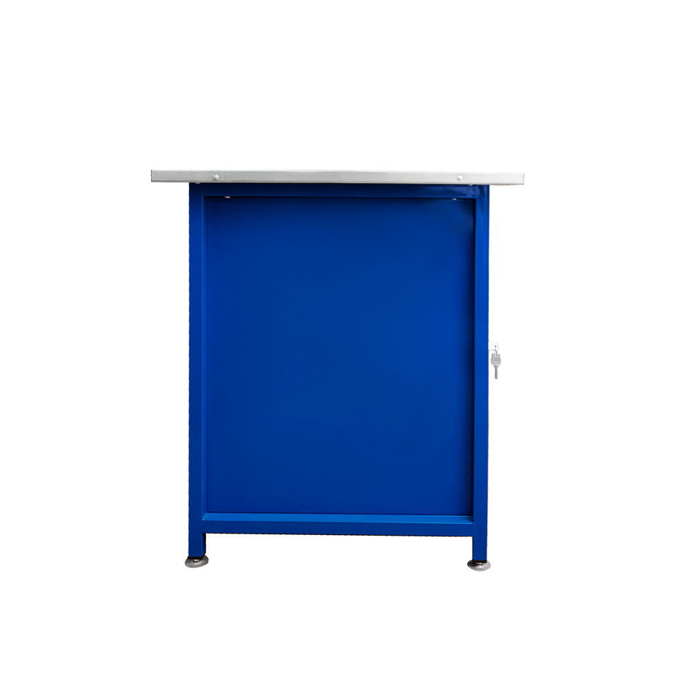 За хранение отвечает тумба Т0 с дверцей. Она закрывается на почтовый замок, внутри установлена съемная полка — удобно разделять расходники, электроинструмент и оснастку, чтобы на столе оставалось свободное место.